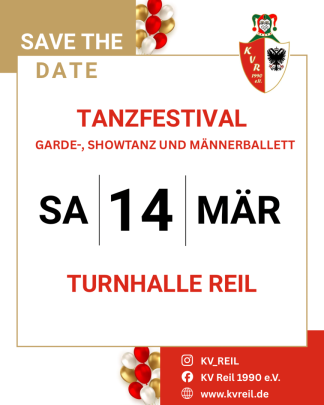 Am Samstag, 14. März 2026 veranstalten wir unser 8. Tanzfestival in der Turnhalle Reil und laden euch herzlich dazu ein.